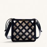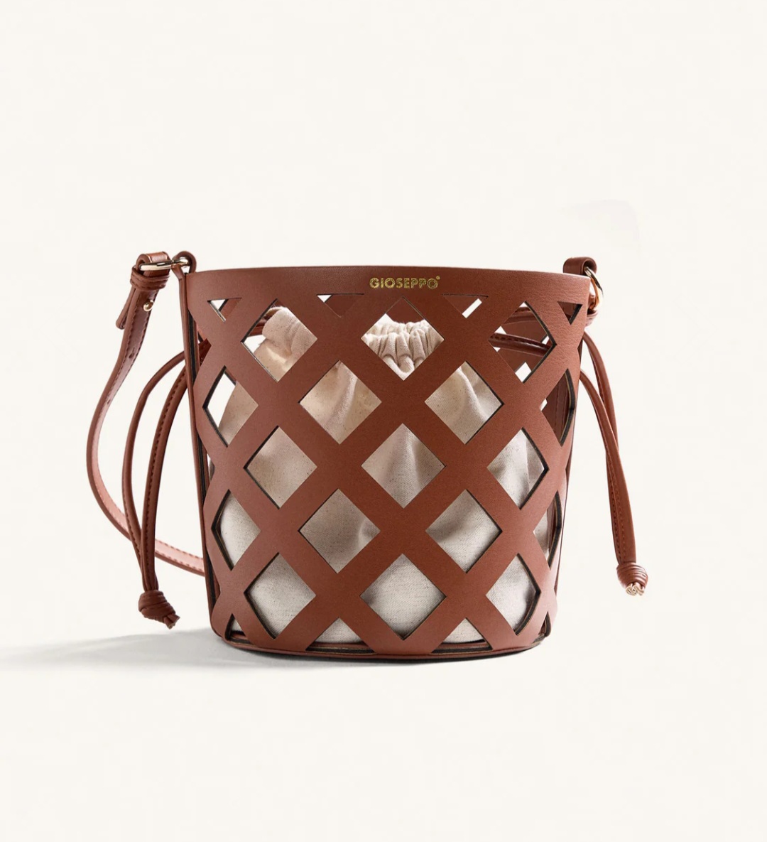 Bolso tipo bucket con diseño calado. Forro interior y cierre con cordón ajustable. Asa larga.