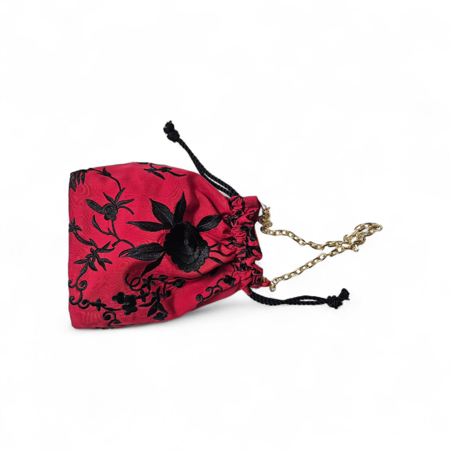 Bolso bordado flores de mantón de Manila. Forrada. Con asa de cadena dorada y cierre fruncido con cordón de seda.