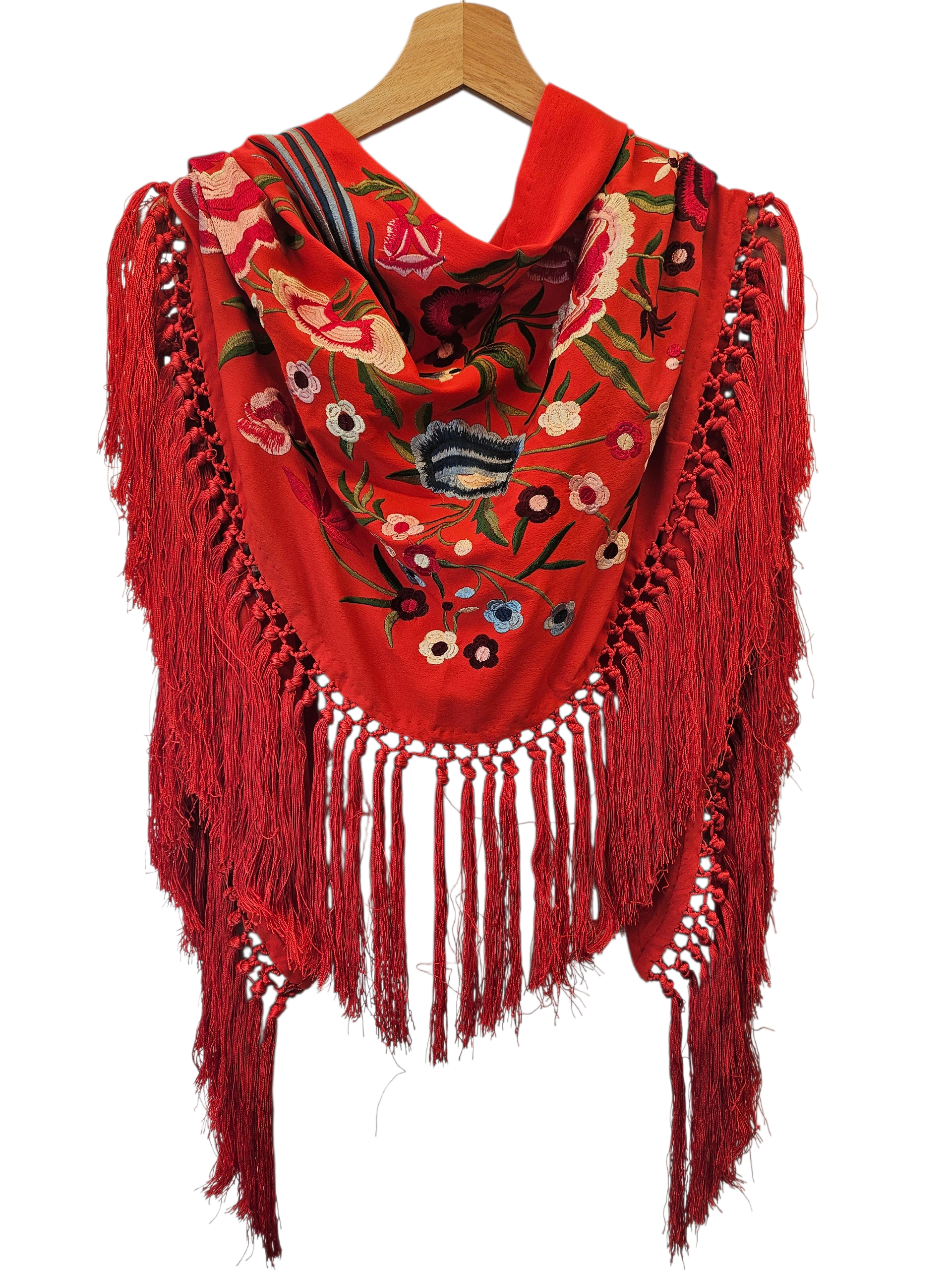 Mantoncillo en crespón de seda bordado de flores de colores sobre fondo rojo. Flecado a mano con fleco de seda. 150x50cm.