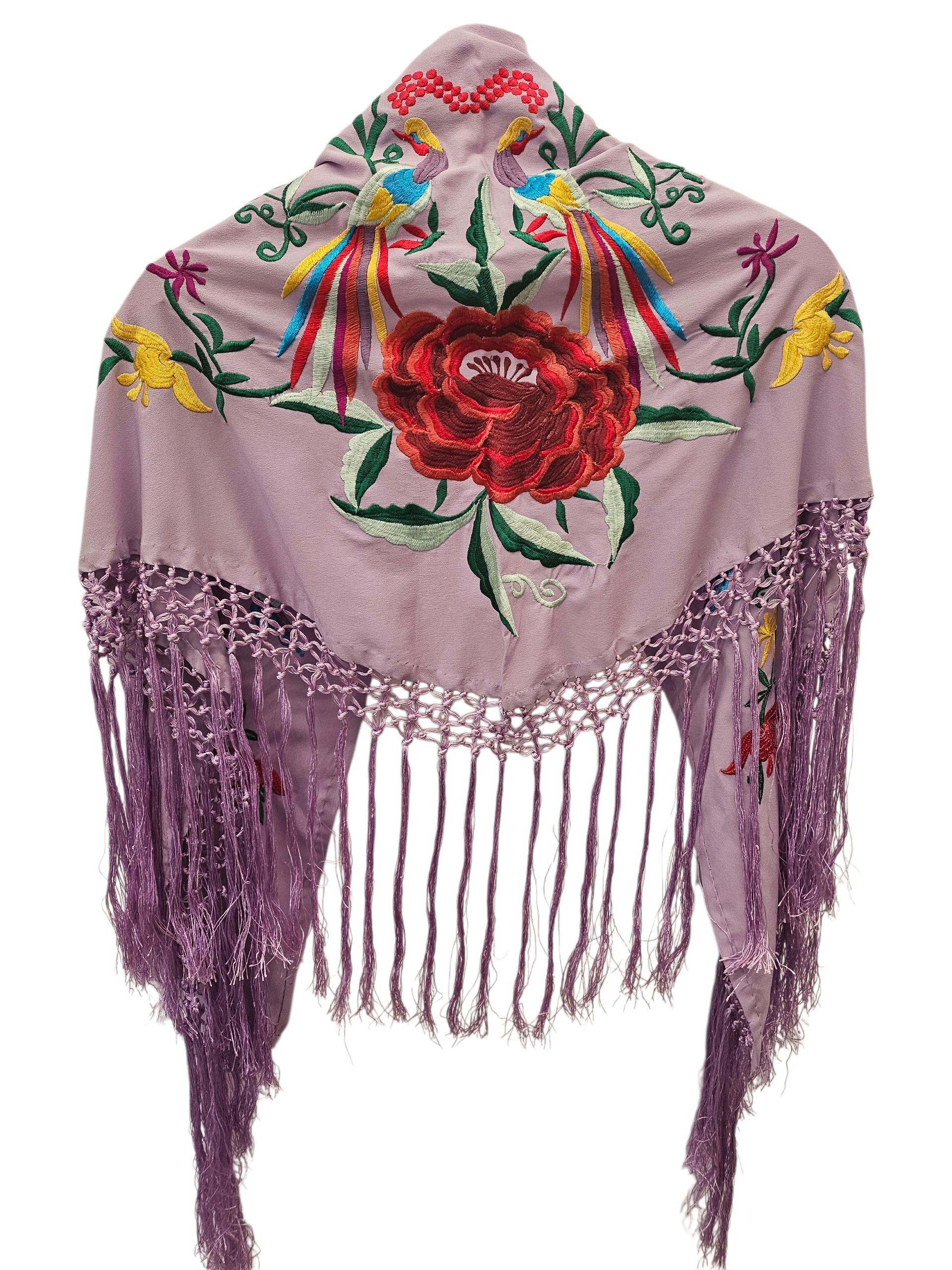 Mantoncillo bordado en varios colores sobre fondo lila. Flecado a mano con fleco de seda.