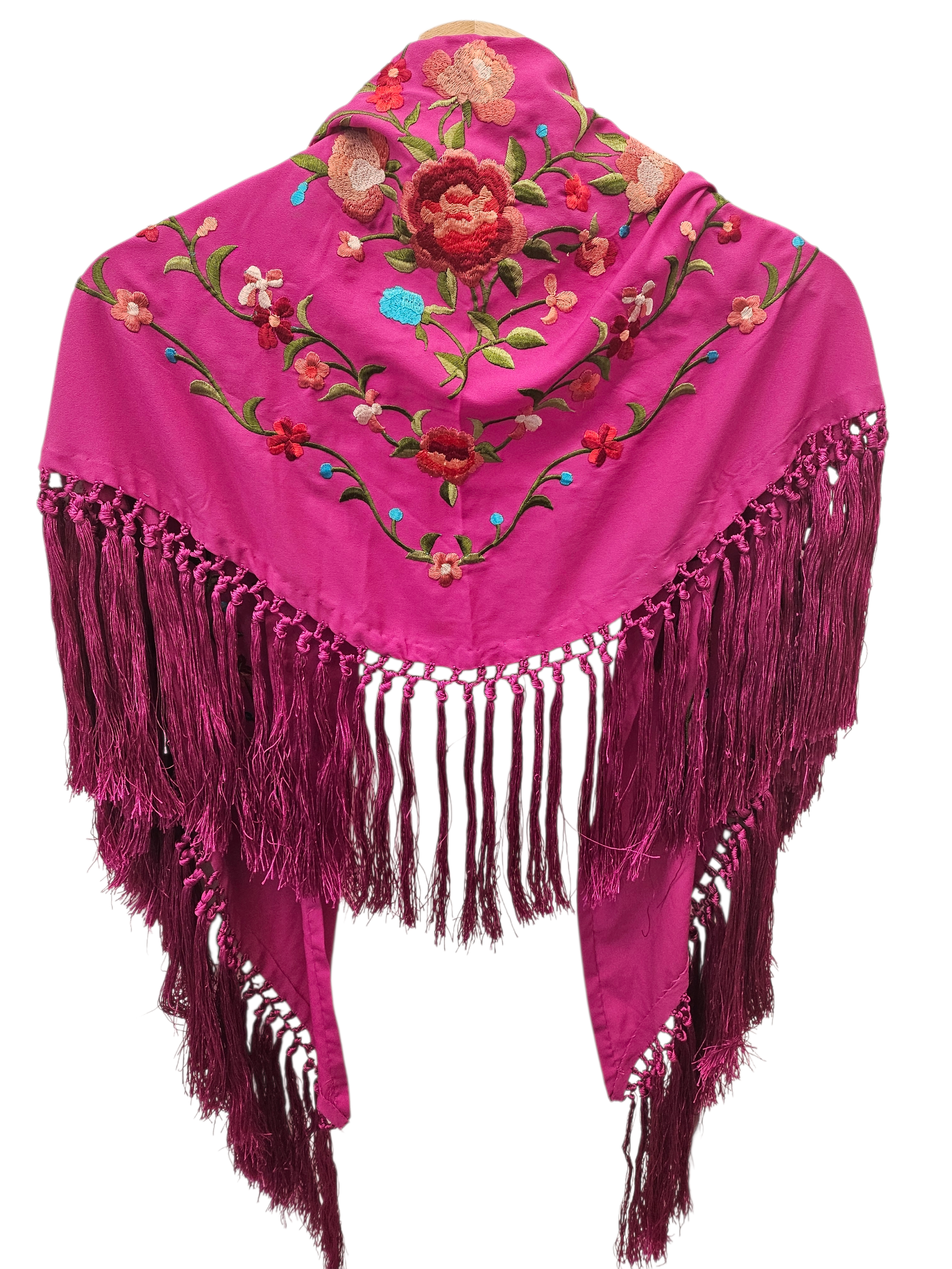 Mantoncillo flamenco de seda bordado multicolor sobre fondo buganvilla. Flecado a mano con flecos de seda.